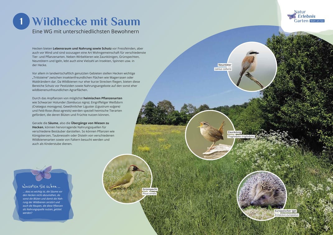 Weißdorn (Crataegus monogyna), Gewöhnlicher Liguster (Ligustrum vulgare) und Feld-Rose (Rosa agrestis) werden speziell heimische Tierarten unterstützt, die